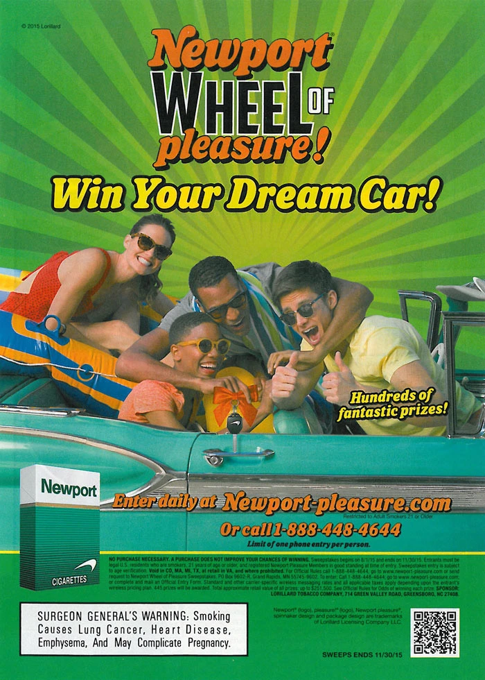 The tobacco manufacture frequently uses sweepstakes and contests to get people hooked and keep the profits rolling in like this 2015/2016 Newport menthol cigarettes ad. However, smoking is anything just a game, ultimately killing upwards to half of long-term users.